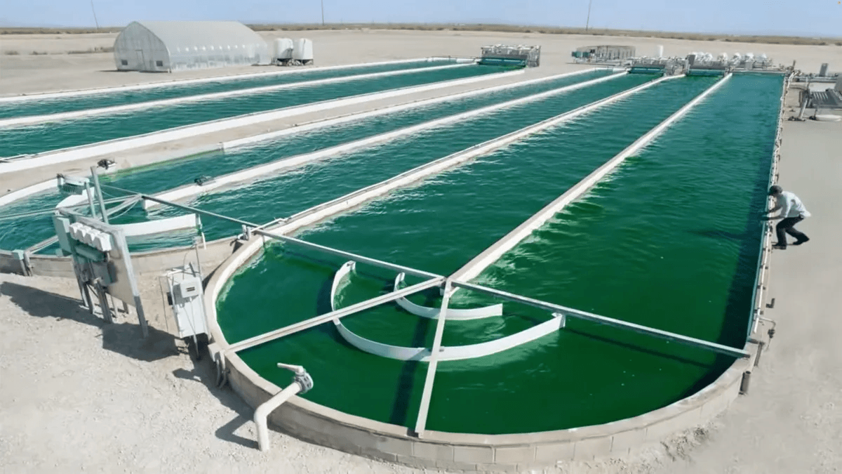 The sun crests over a California facility. A guitar twangs a gritty version of “Farmer in the Dell” over shots of massive outdoor ponds sloshing with bright green liquid. Lab-coated scientists beam.