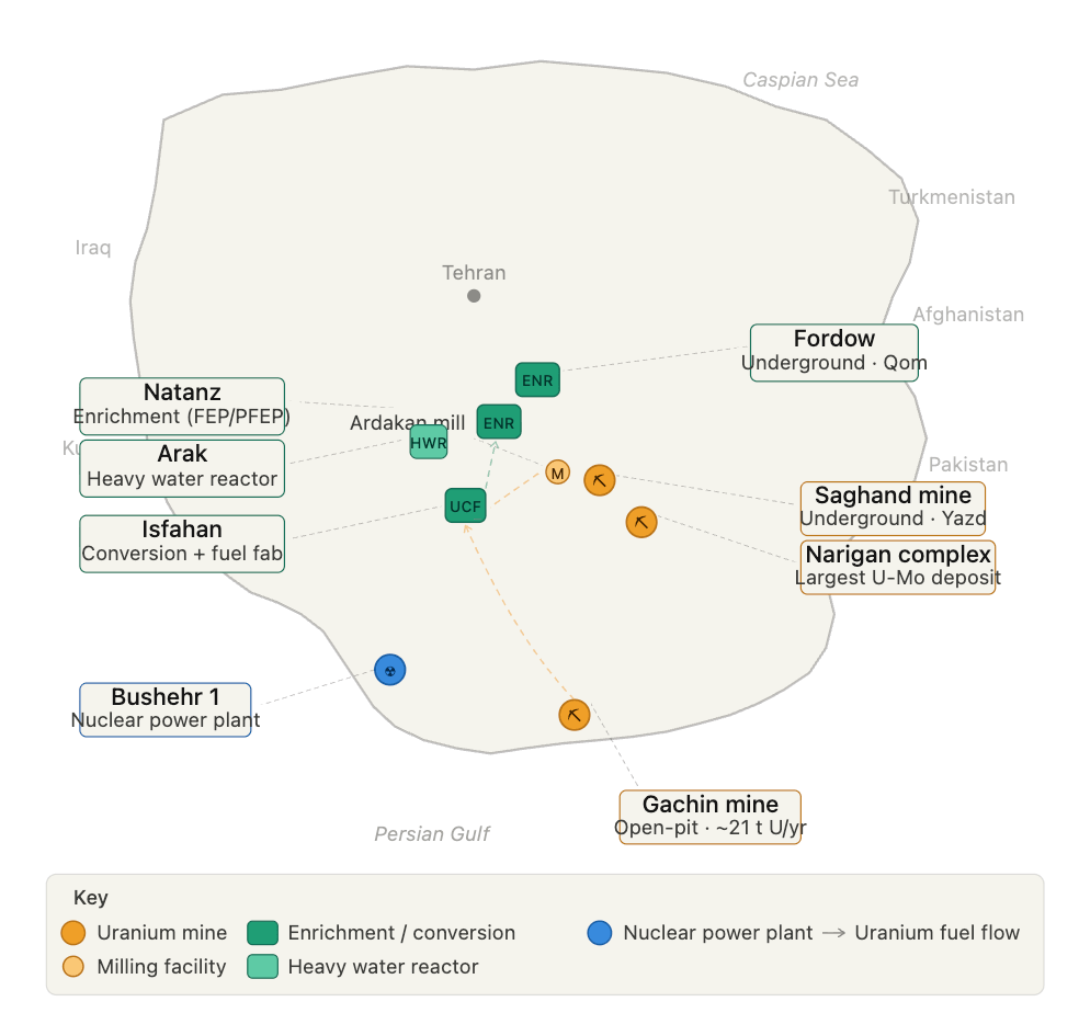 A third site — the Narigan Mining and Industrial Complex, also in Yazd province — began operations in 2023 and is Iran’s largest uranium deposit, holding an estimated 650 tonnes of uranium.